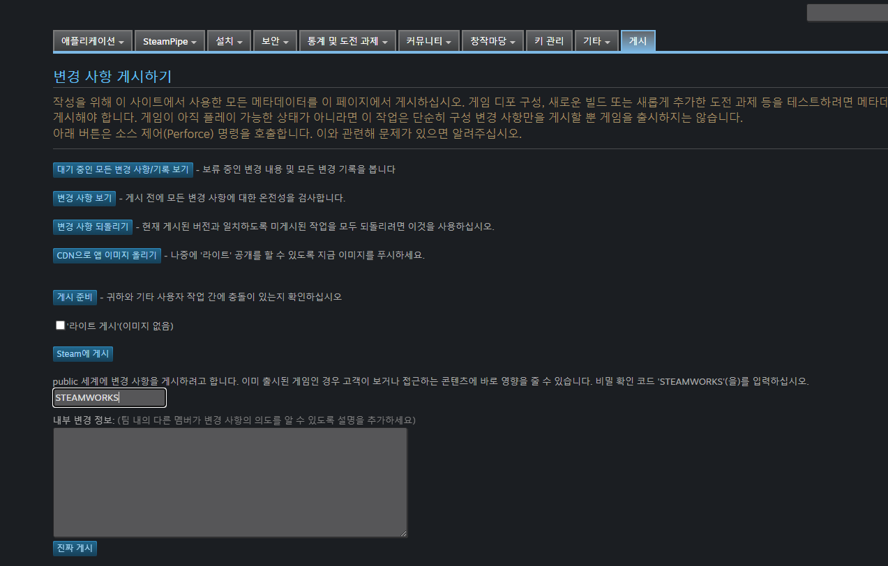 마지막으로 게시 tab으로 가서 steam에 게시를 누르고 스팀에 검증요청을 하면 됩니다. 저는 하루만에 승인이 났습니다.