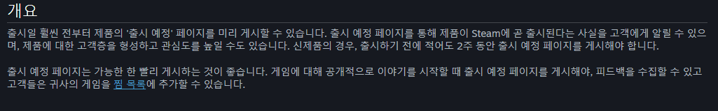 - 스팀 홈페이지에서도 "출시 예정 페이지는 가능한 한 빨리 게시하는 것이 좋습니다."라고 하고있습니다.
