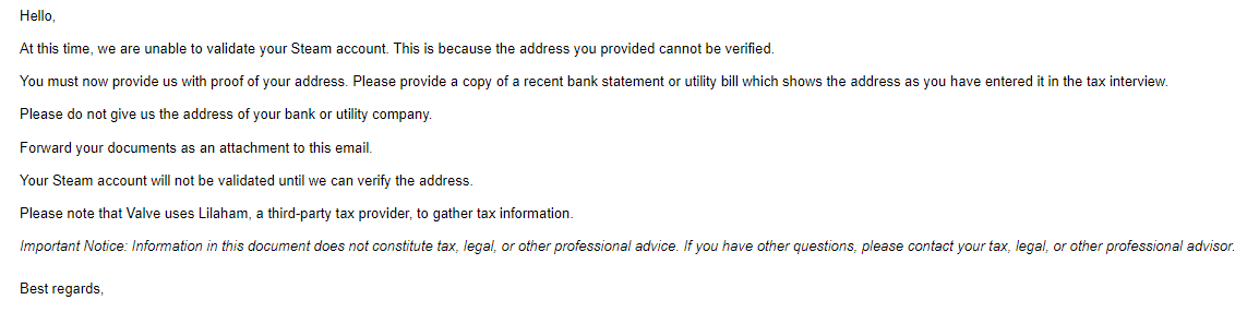 스팀이 나에게 "INVALID ADDRESS" 제목의 메일을 보냈다.