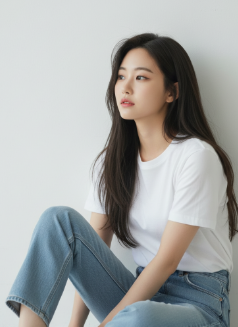 - 의상: 심플한 흰색 반팔 티셔츠, 연청 데님