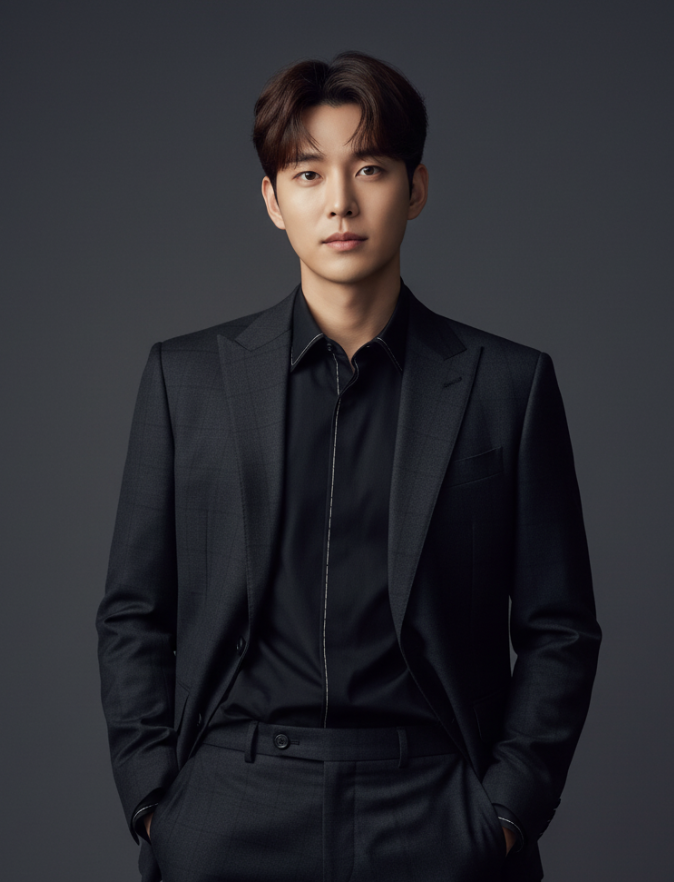 - 조명: 시네마틱한 부드러운 조명, 피부와 수트 질감을 선명하게 강조