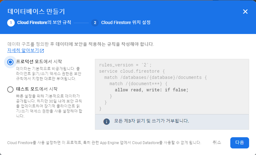 1. Firestore database 만들기