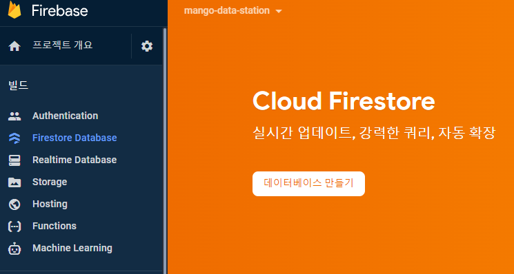 Firestore Database 메뉴 -> 데이터베이스 만들기 버튼을 눌러 만들면 됩니다.
